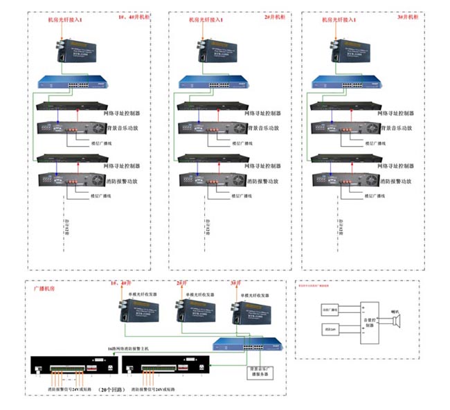 泰州碧桂園五星級大酒店位于江蘇省泰州市海陵區(qū)泰東河大橋北側(cè),地處生態(tài)旅游區(qū)。本次廣播設(shè)計安裝全金屬音箱1265只,按照功能分為40個區(qū)域,每個區(qū)域同時播放不同背景音樂;設(shè)置中心主控機房一個,分中心機房4個;廣播系統(tǒng)與酒店消防報警系統(tǒng)聯(lián)動實現(xiàn)N-3、N-2、N-1、N、N+1、N+2、N+3報警。